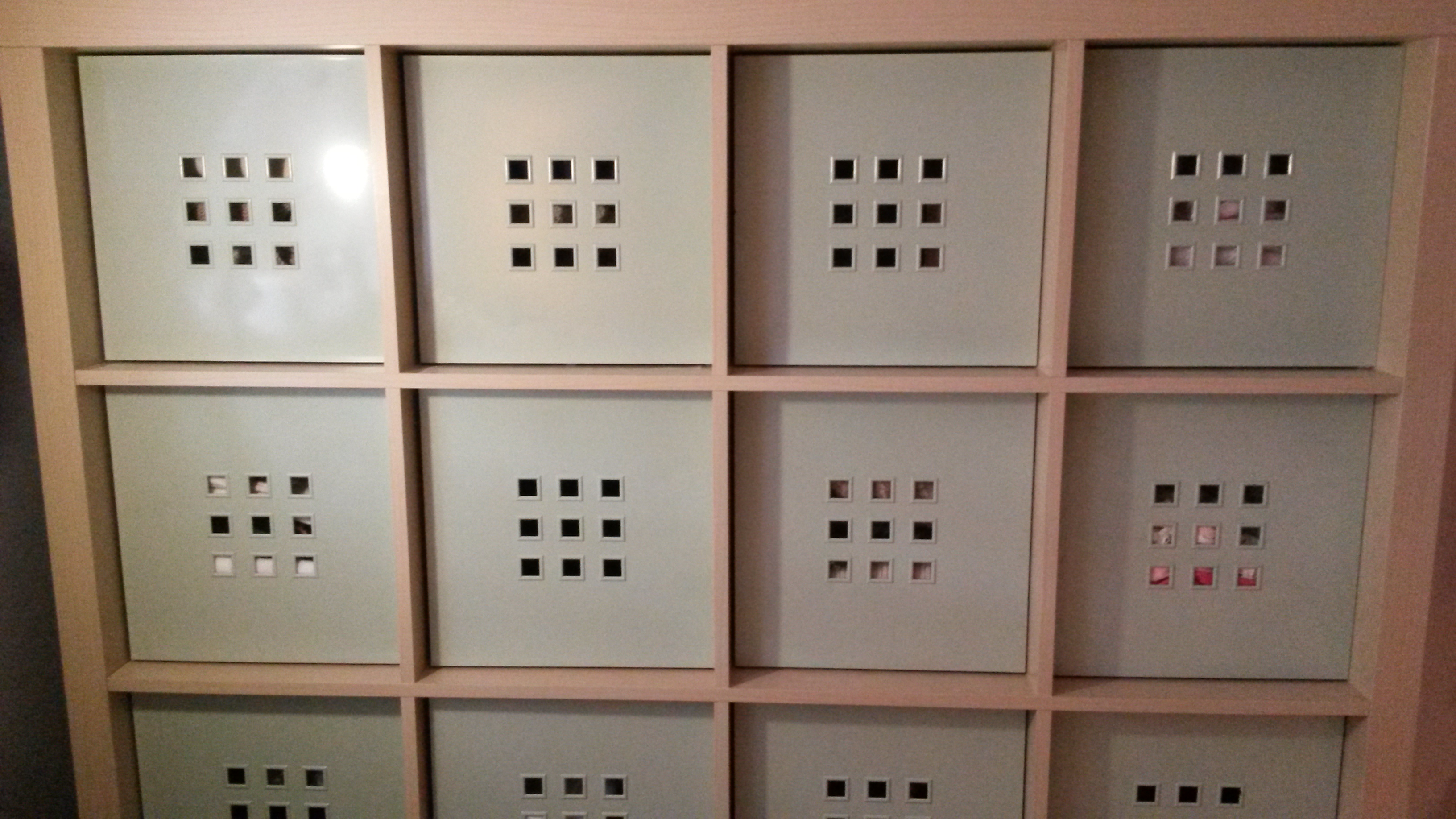 I decided to paint just the front of each cube which was far cheaper than buying new storage cubes. I’m sure other people must have done this but I couldn’t find any examples. So I thought I’d post what an amazing difference a couple of cans of spray paint can make. I used Krylon Fusion for Plastic spray paint in a color called Honeydew Melon. I gave each cube front two coats of paint to get a nice solid color. I didn’t paint the sides because I didn’t want to risk the paint rubbing off onto the wood. I also left the backs unpainted so, if I wanted, I could change the color. If you paint cubes that are already assembled make sure to tape off the backs of the little square openings or you will have paint inside the cubes as well.