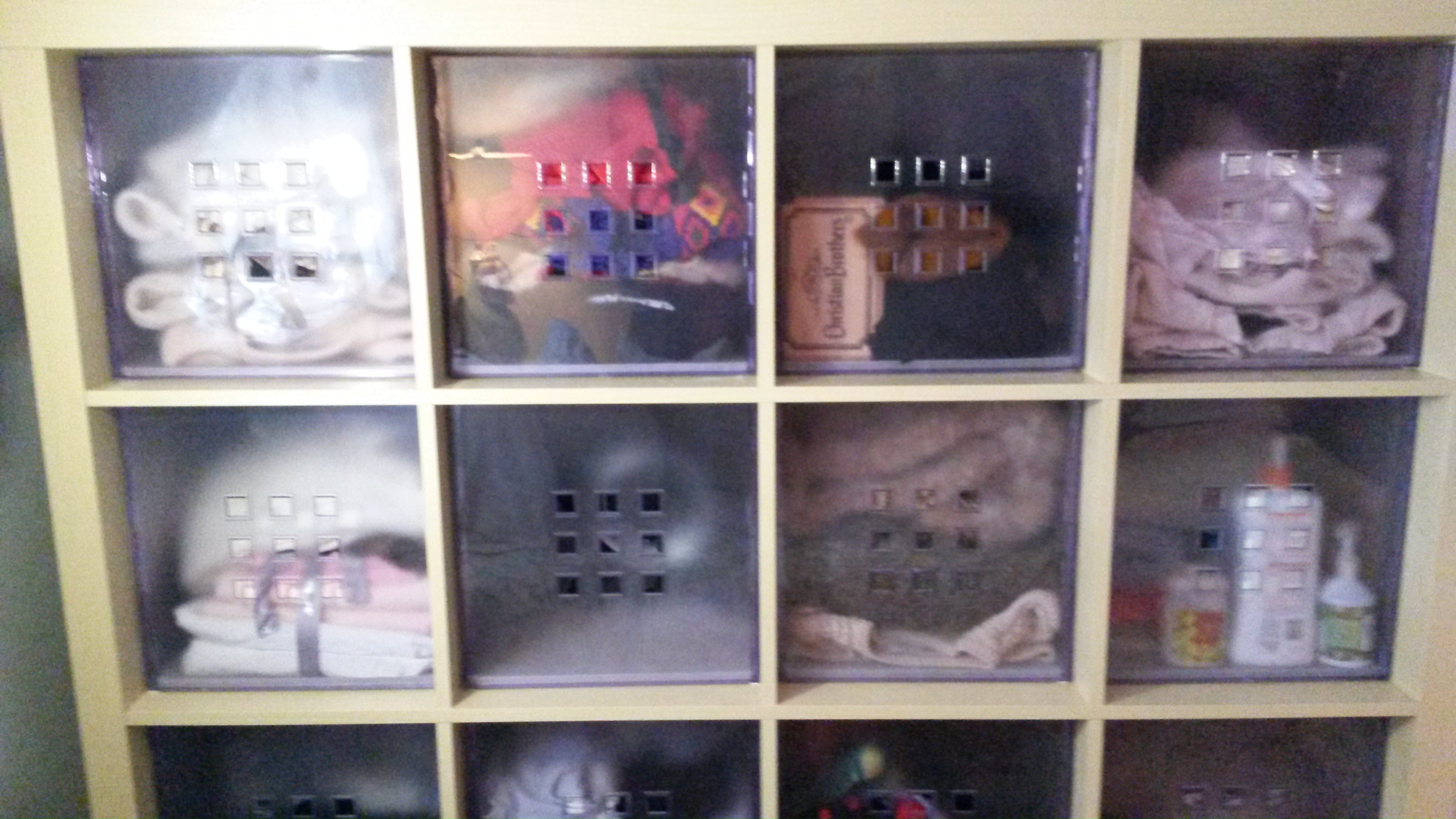 We had purchased IKEA cube shelving for our two boys because they were great for clothing as well as toys. The look is so basic that the cubes worked for the boys even as they got older. The shelves were called Expedit I think and I’m sure most people have seen them. Our eldest son had a 4 x 4 cube shelf that he didn’t want to take with him when he finally flew the nest a couple of years ago. I moved it into our tiny third bedroom that would eventually become my girly spare bedroom /walk in closet /reading retreat.