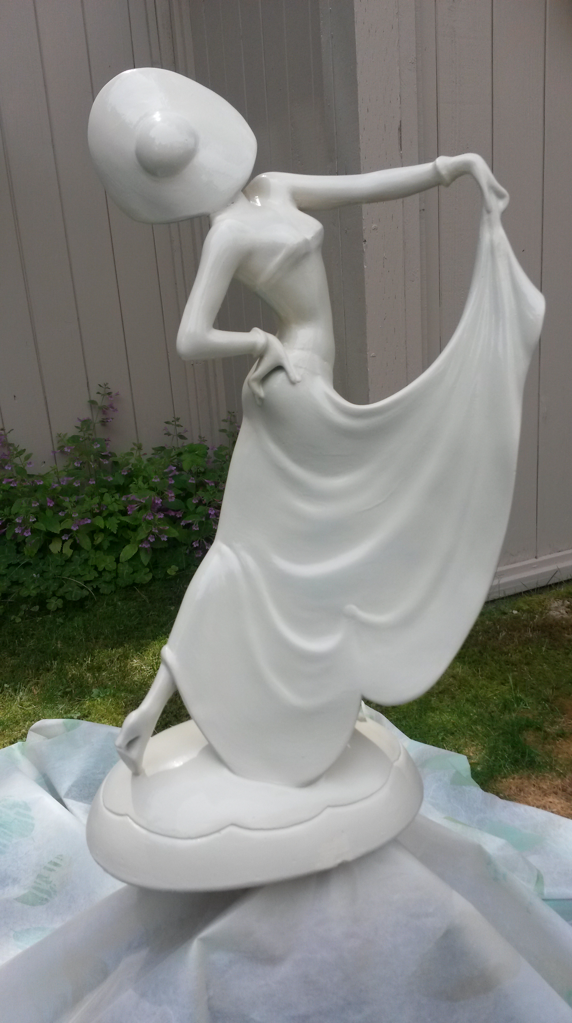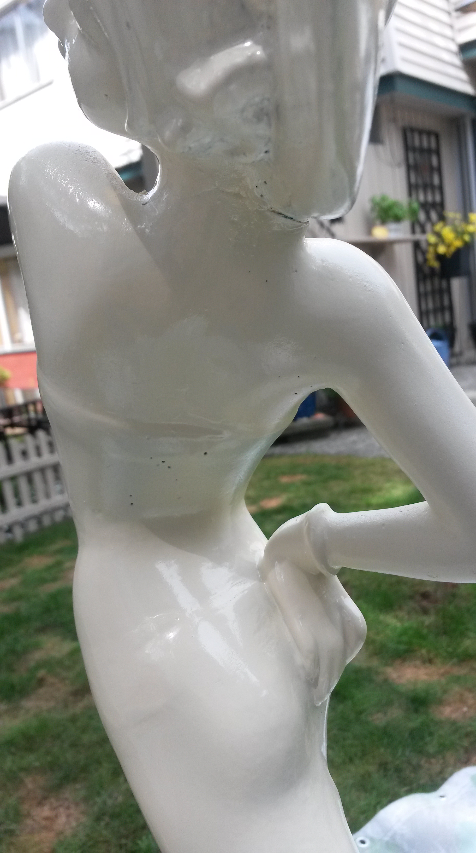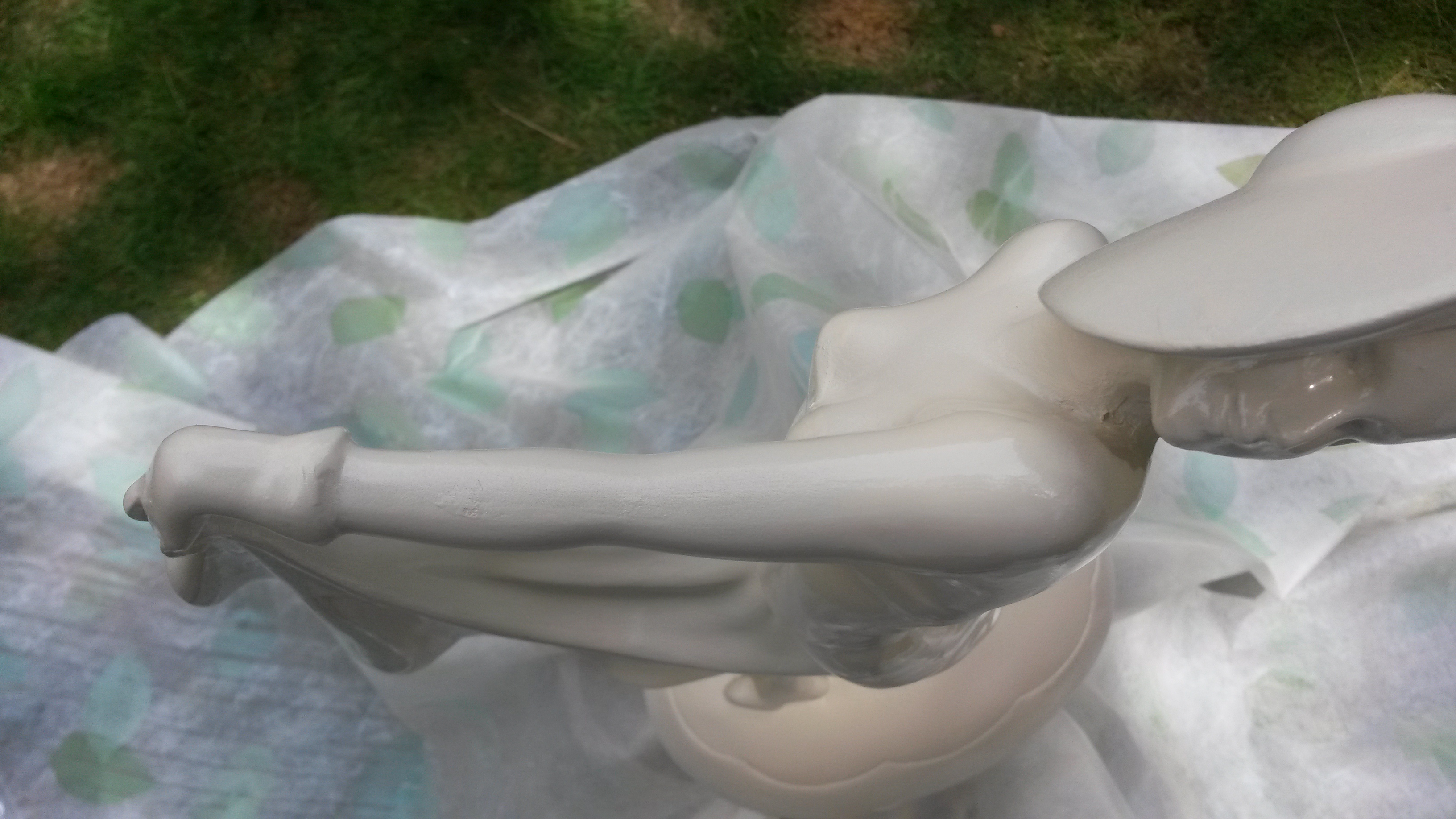 The plan is to mend all of her chips and fill the dozens of tiny pinholes that dot her surface. Then sand her down and give her a new coat of pale ivory paint. The lines of the figurine are what I find most appealing and that is what I want to bring out. So by painting her all one color I hope to give her a longer and more graceful appearance.